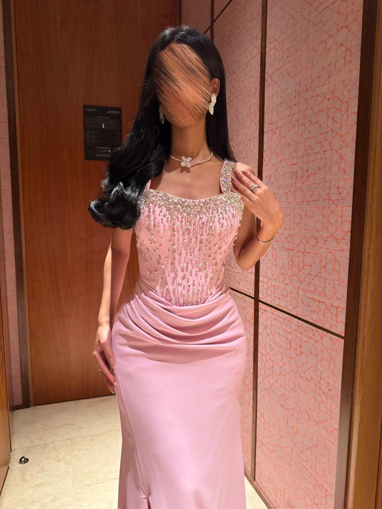 القصة : فستان طويل بستايل سهره ضيق من الأعلى منطقة الصدر مزينة بتطريزات لامعة